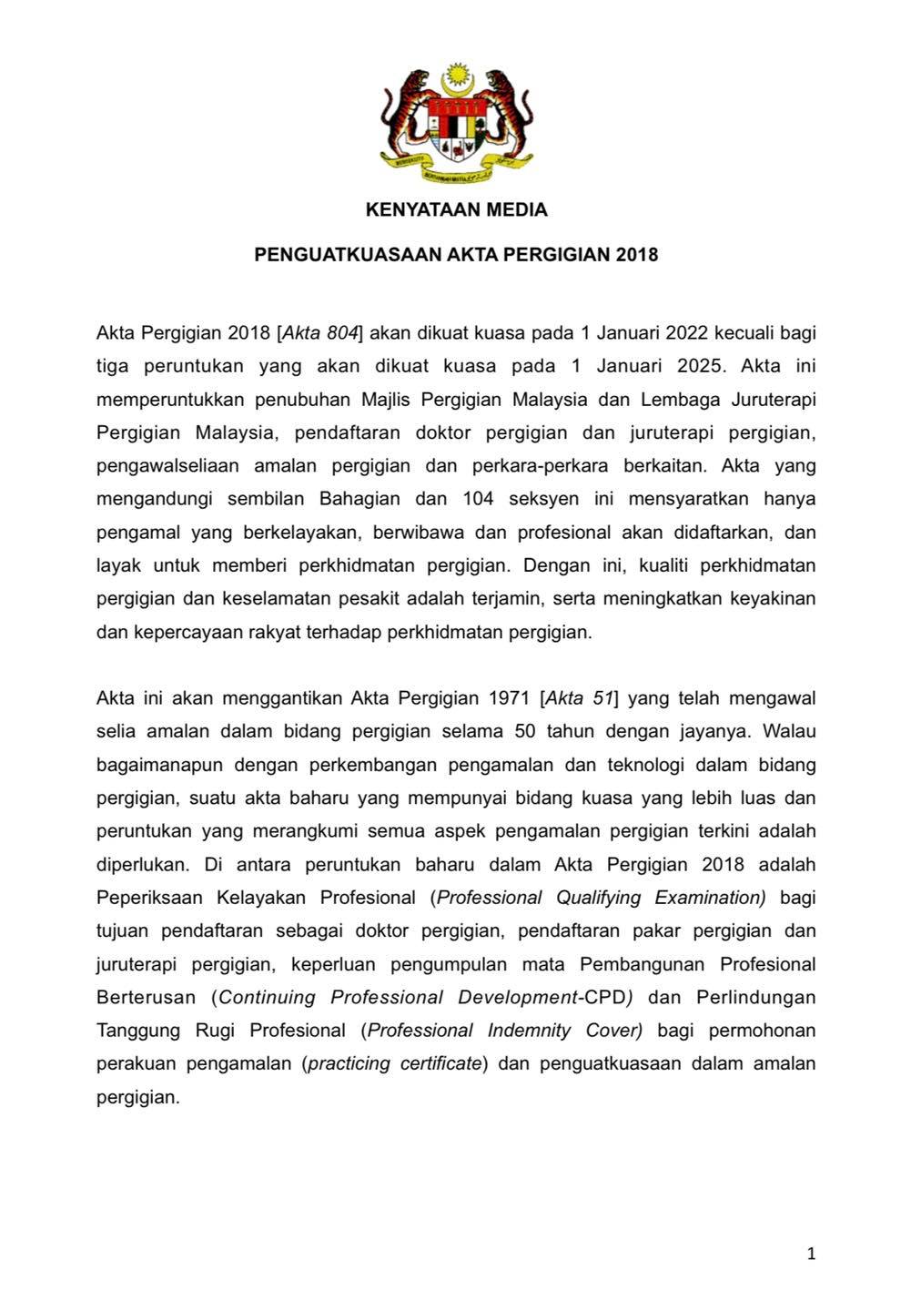 New Dental Act effective from January PUTRAJAYA. The official webportal of the Malaysian Dental Council majlis pergigian malaysia dental pergigian malaysia oral health APC TPC mdc mpm kkm moh mdc moh mpm kkm mdc. The Dental Act 1971 Act 51 which has been in force since 1972 is repealed on 1 January 2022.